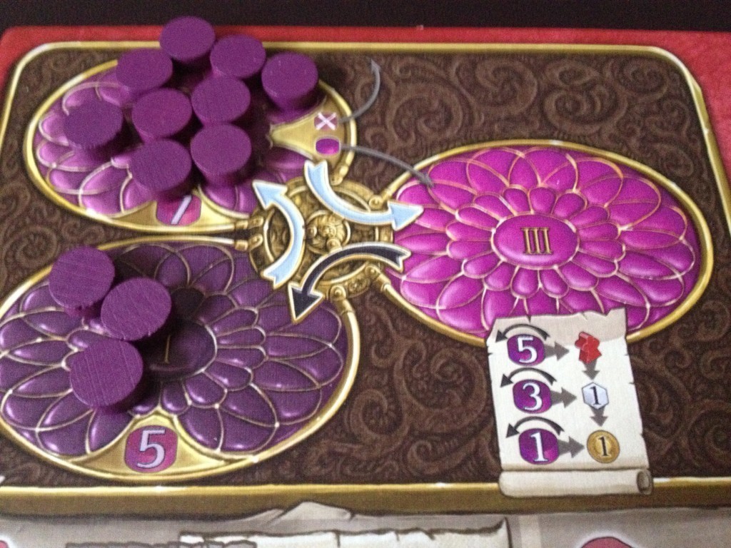 Magic power in Terra Mystica has probably the most unique mechanic in the game. Your faction board has three purple bowls. One bowl is available power, One bowl is expended power and the third bowl is recharging power. All throughout the game, you will see the purple power icon with a small number in it. That number is power value you gain as an income. (or in some stages immediately on the worship track) Whenever you gain power, you have to prioritize the “Expended” bowl first, shifting little power tokens from expended to recharging for each power you gain. Once your expended bowl is empty, for each power you gain you shift a token in the “recharging” bowl into the “available” bowl. This power can now be used to cast spells and perform effects. Once you spend the tokens on the spell, you shift them to the “depleted” bowl and the cycle begins anew. As a nifty emergency option, you can also permanently burn power tokens from your recharging bowl (IE: remove them from the game and reduce your available magic power) to force power into the Available bowl. This results in a game of constant manipulation and adjustment of your power and opens up a lots of additional possibilities if you develop your lands into a “spell engine” of sorts.