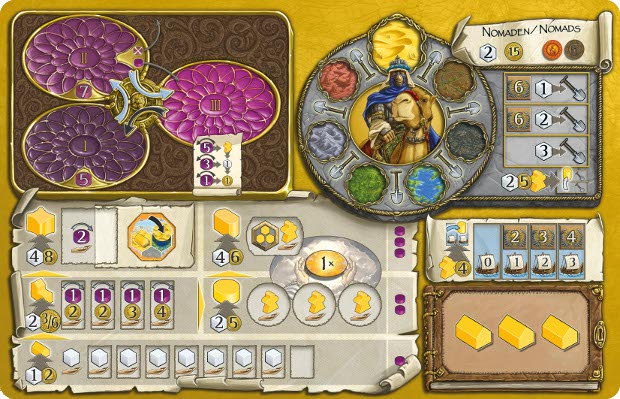 Each player gets one of the double sided faction boards, determining their colour and factional powers. Once that is done the players then choose a starting bonus. There are nine separate starting bonuses tiles. Once again these are selected at random for each game, mixing it up every time you play) so that you have tiles equal to the number of players plus three. Each player will get their selected bonus for one round, then the bonuses will cycle out. IE: the first person to pass for that round, gets to to choose a new bonus tile from those available for the next round, leaving their previous tile behind (as a potential choice for another player). This clever mechanic means that sometimes you may pass a little early to get a particular bonus tile you want for the next round. (After all, your resources can always be used to complete that building project next round no?)